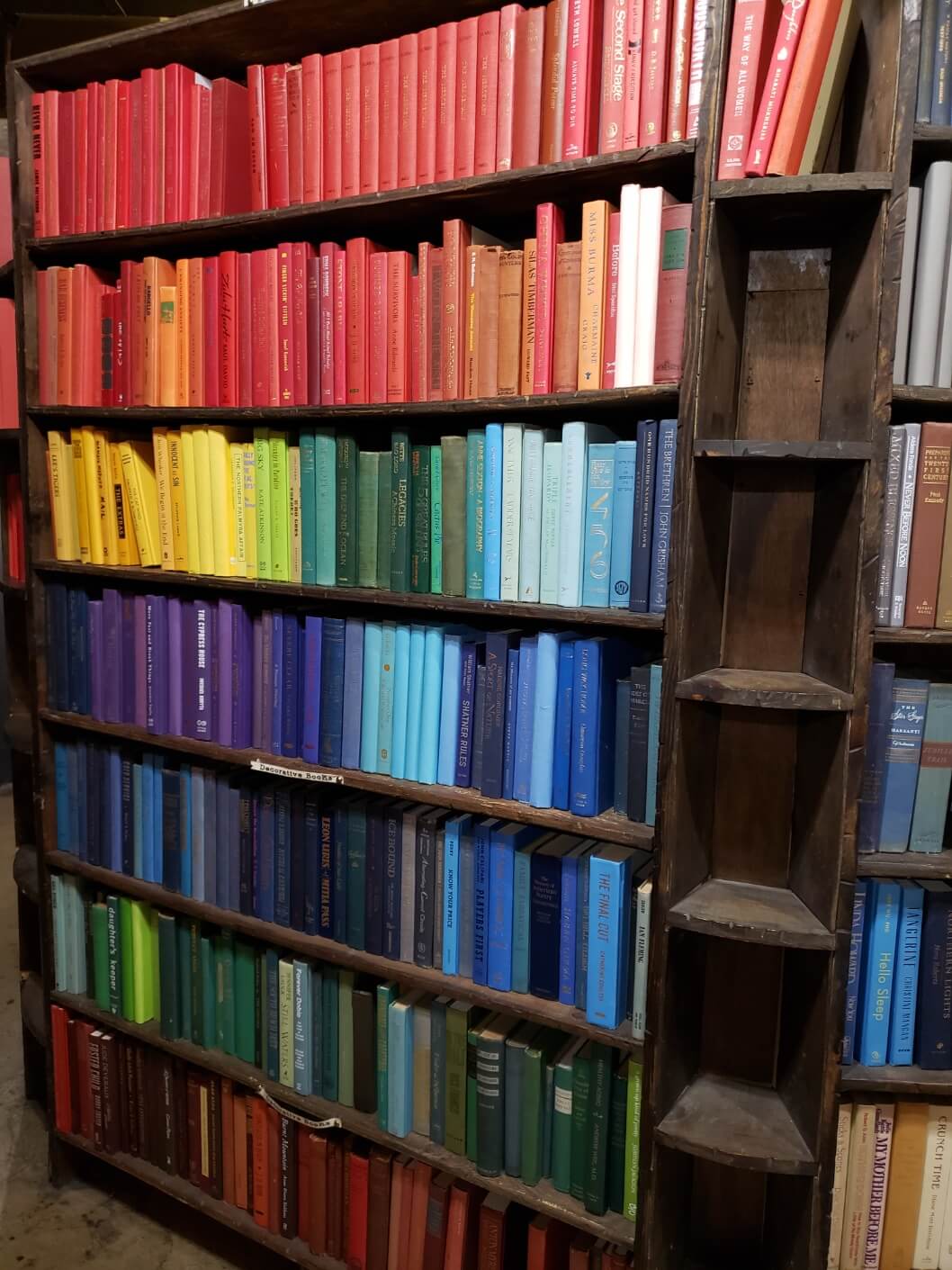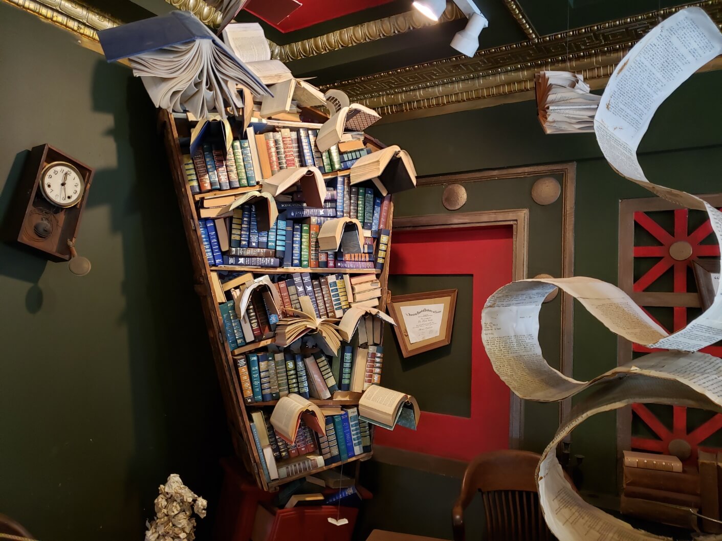 2층에는 옛날 코믹 만화부터 뜯지 않은 하드커버 코믹도 있고, 어린이 책과 용도를 알 수 없는 각종 모형과 기계들이 박물관처럼 전시되어 있습니다. 또 미로처럼 공간이 꼬여있고 넓으며 책으로 만든 구름다리와 비밀 창고 같은 곳도 구경할 수 있습니다. 비밀 창고 같은 곳에는 공포책만 따로 모여있다거나, 특정 시대 책들만 구비되어 있어서 더 으스스한 분위기를 풍깁니다. 그리고 무지개 색 순서대로 책 표지 색깔에 따라 모아둔 책장도 있습니다. 책들끼리는 아무 관련이 없는데, 책 표지 색으로만 비슷한 것들끼리 모아둔 게 신박하고 재미있습니다.