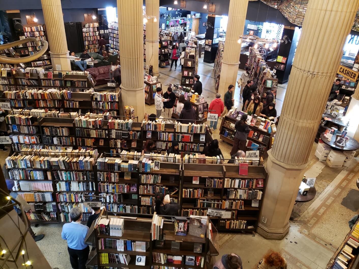 LA에 이곳 말고도 다른 서점이 많이 있지만, 체인점이 아닌 독특한 분위기의 오래된 서점을 가보고 싶었습니다. 거기에 2층에서 보면 이렇게 책들이 빽빽하게 꽂혀 있는 풍경이 눈을 사로잡아서, 다운타운에 가면 꼭 한 번 가보고 싶었던 서점입니다. 주말에 가면 서점 바로 앞에서 남미 음식 벼룩시장 같은 게 열립니다. 거기서 마음에 드는 간식 하나 골라 먹고 들어가도 괜찮습니다. 다른 서점과 또 다른 점은 서점 입장 시, 큰 가방을 들고 있는 경우 그건 라커룸에 넣거나 카운터에 맡겨야 한다는 겁니다. 처음에는 무슨 서점에서 가방을 못 들고 들어가게 하나 싶어 이상하다 생각했습니다.