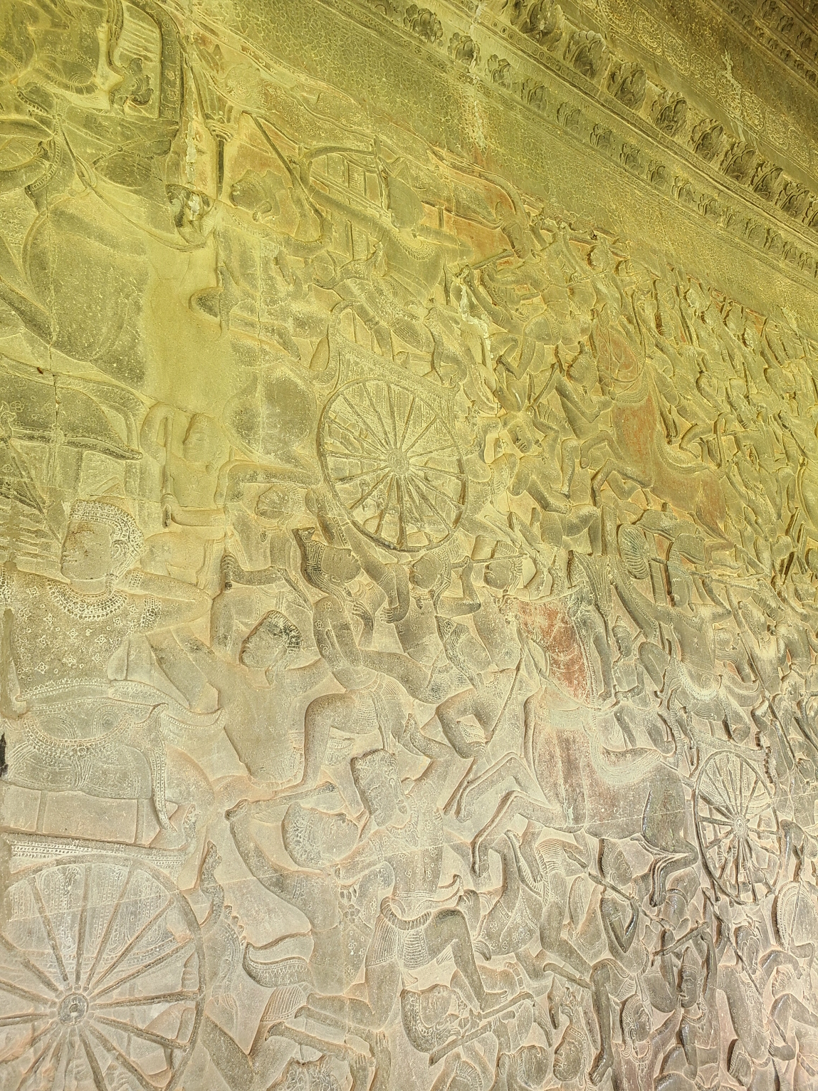 앙코르와트 벽의 부조뿐만 아니라 각 문틀과 문설주에 새겨진 기하학무늬, 꽃무늬 등도 자세히 보세요. 엄청난 장인의 레벨을 보여주는 작품들입니다. 이 무늬들로 건축 시기를 짐작할 수도 있습니다. 세월에 의해 색은 많이 벗겨졌으나 조각 모양만큼은 지금까지도 너무나 선명합니다. 보존 문제로 인해 손으로 만져보는 건 피하시고 대신 고배율 렌즈나 휴대용 돋보기가 있으면 그 디테일을 충분히 감상하실 수 있습니다.