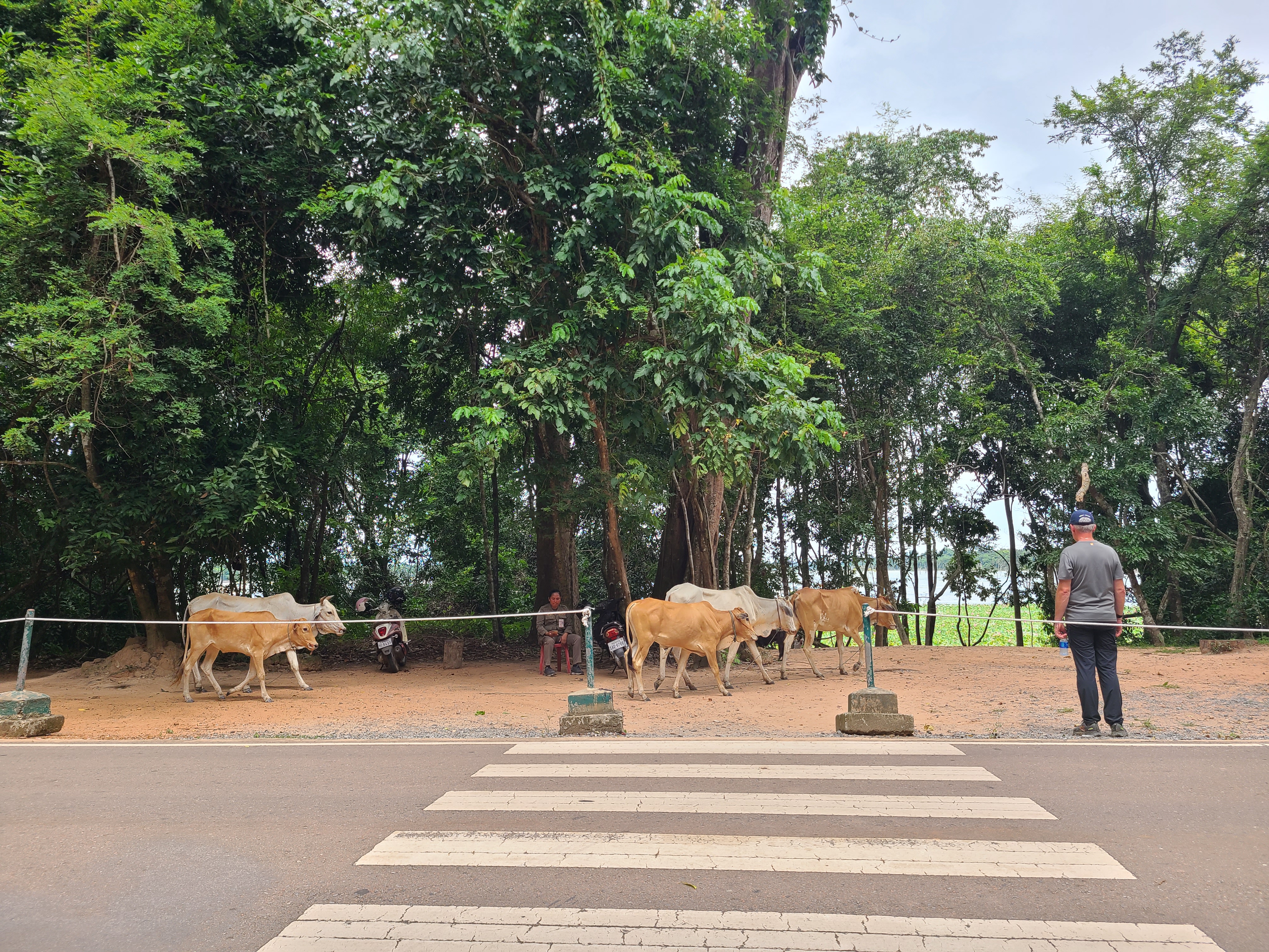 네악 포안에서 타솜 사원으로 가기 위해서는 이 횡단보도 하나만 건너면 됩니다. 그만큼 두 유적지가 바로 앞에 붙어 있어서 한 번에 두 곳을 가기 쉽습니다. 또 이 길은 소 떼들이 자주 이용하기도 하는 길이라, 지나가는 길 강아지와 고양이만큼 소들을 쉽게 볼 수 있습니다.